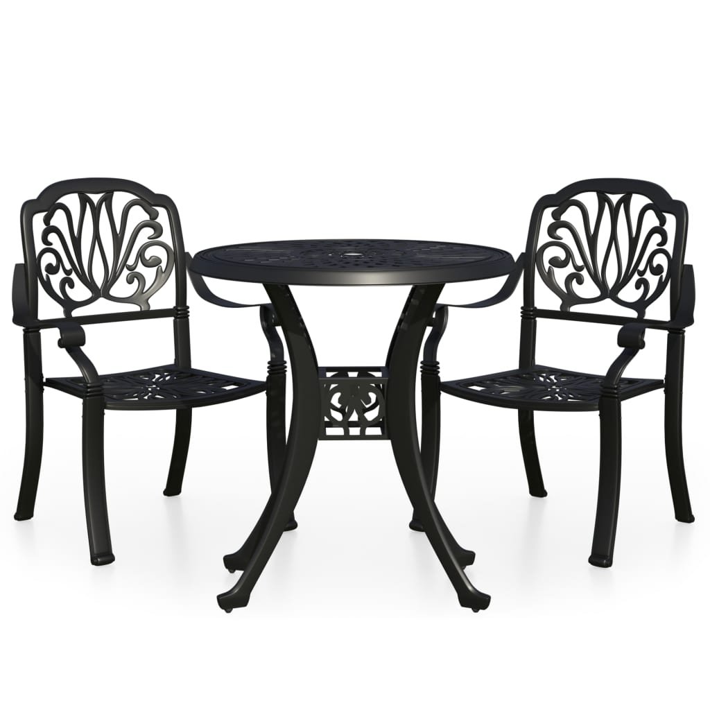 Deze bistroset is gemaakt van gietaluminium en biedt jou en je gasten een comfortabele zitervaring. De tuinstoelen en -tafel zijn gemaakt van gietaluminium waardoor ze zowel stevig als duurzaam zijn. Het roest- en weerbestendige materiaal maakt de meubelset ideaal voor buitengebruik. De prachtige patronen maken van de set een elegante aanvulling op je buitenruimte. Bovendien heeft de tafel een parasolgat waar je parasol perfect in past, om je te beschermen tegen zon of regen. Opmerking: om de levensduur van je tuinmeubelen te verlengen, raden wij je aan om de meubelen met een waterbestendige hoes af te dekken Maximaal 110 kg per zitting.