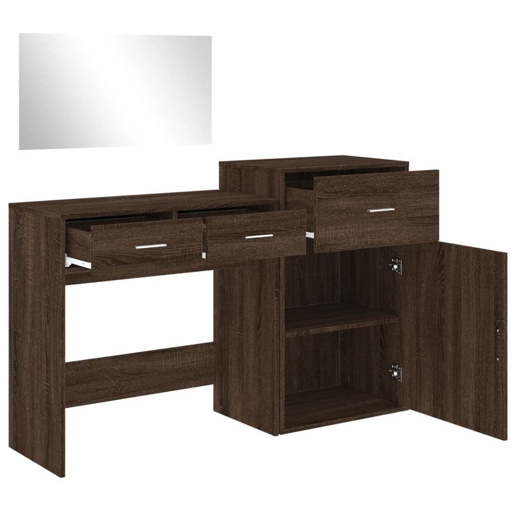 Deze kaptafelset geeft je slaapkamer een tijdloze en verfijnde uitstraling. De make-uptafel met opbergkast is een geweldige aanvulling op het interieur van je slaapkamer, terwijl je je cosmetica binnen handbereik hebt! Duurzaam en stevig materiaal: het bewerkte hout is van hoge kwaliteit, heeft een glad oppervlak en is sterk, stabiel en vochtbestendig.Kaptafelspiegel: de make-up spiegel is perfect voor je dagelijkse schoonheidsroutine. De spiegel stelt je in staat om je gezichtshuid te verzorgen en ook je make-up aan te brengen!Voldoende opbergruimte: de make-uptafel met kast biedt voldoende ruimte om je make-up, sieraden en andere dagelijkse benodigdheden binnen handbereik te hebben.Modern ontwerp: het moderne ontwerp biedt strakke lijnen en een minimalistische uitstraling als onderdeel van de interieurstijl. Waarschuwing:Om kantelen te voorkomen moet dit product met de bijgeleverde bevestigingsmaterialen aan de muur gemonteerd worden.