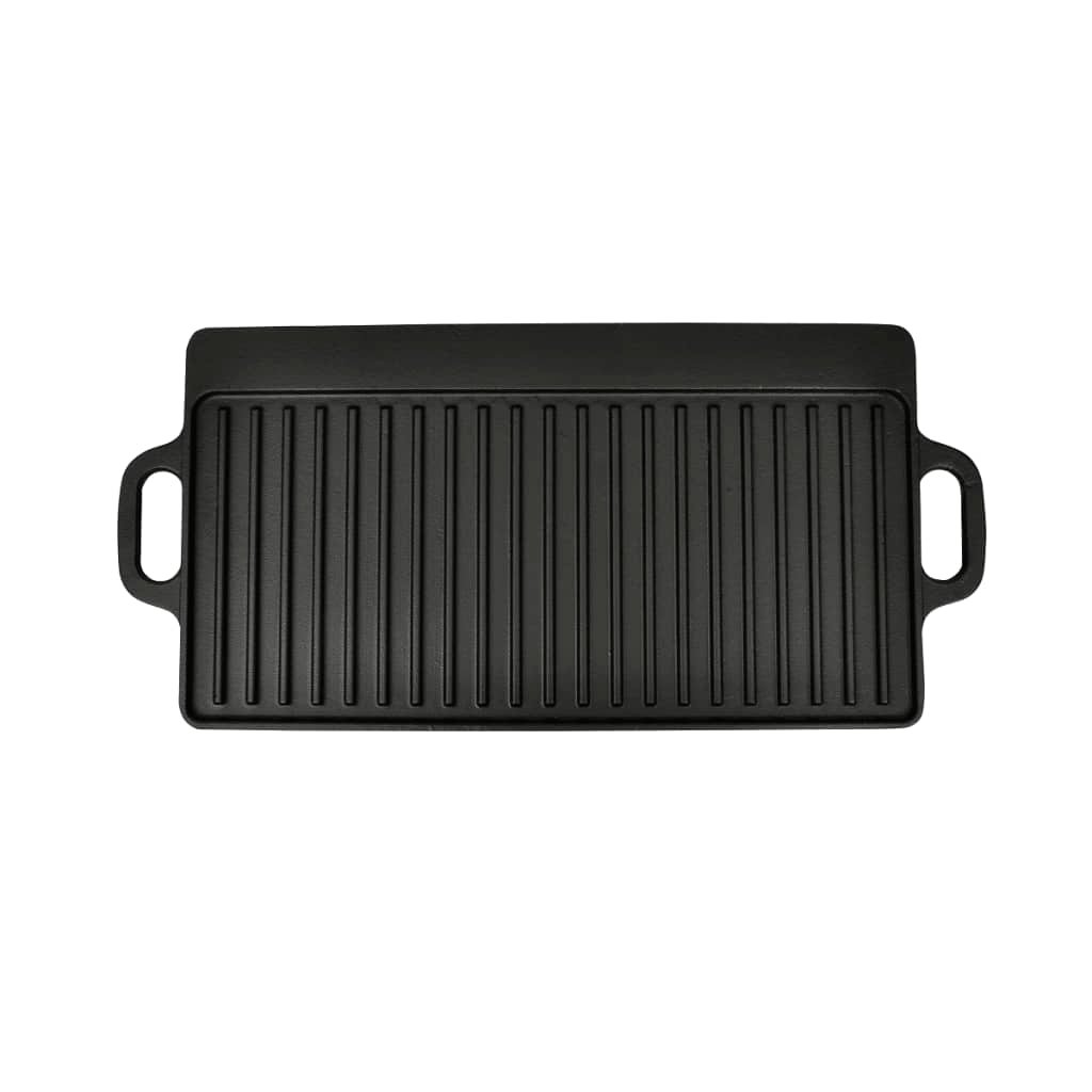Onze hoogwaardige gietijzeren dubbelzijdige BBQ/pizzaplaat maakt koken een leuke ervaring!Deze veelzijdige 50×23 cm gietijzeren barbecueplaat is dubbelzijdig wat hem perfect maakt om thuis of op de camping te gebruiken. De gladde kant kan gebruikt worden voor het bakken van pizza’s, het roosteren van boterhammen, het bakken van eieren, bacon en groente, en nog veel meer. De geribbelde kant van de plaat vereist geen olie of boter bij het koken, dus hij is ideaal voor het grillen van vis en vlees voor een gezondere maaltijd. Het ontwerp zorgt ervoor dat vet weg druipt tijdens het eten, zodat u gebraden, restaurantwaardig eten eenvoudig op tafel zet. De plaat is ook geschikt voor gebruik in de oven. Aan beide kanten zit een praktisch handvat. De plaat is voorbehandeld en gaat jarenlang mee. Het gietijzer heeft een anti-aanbaklaag en is hittegeleidend. Zorg ervoor dat u de instructies en tips voor onderhoud goed opvolgt. De plaat moet met heet water en zonder afwasmiddel worden schoongemaakt. Hij kan niet in de vaatwasser.