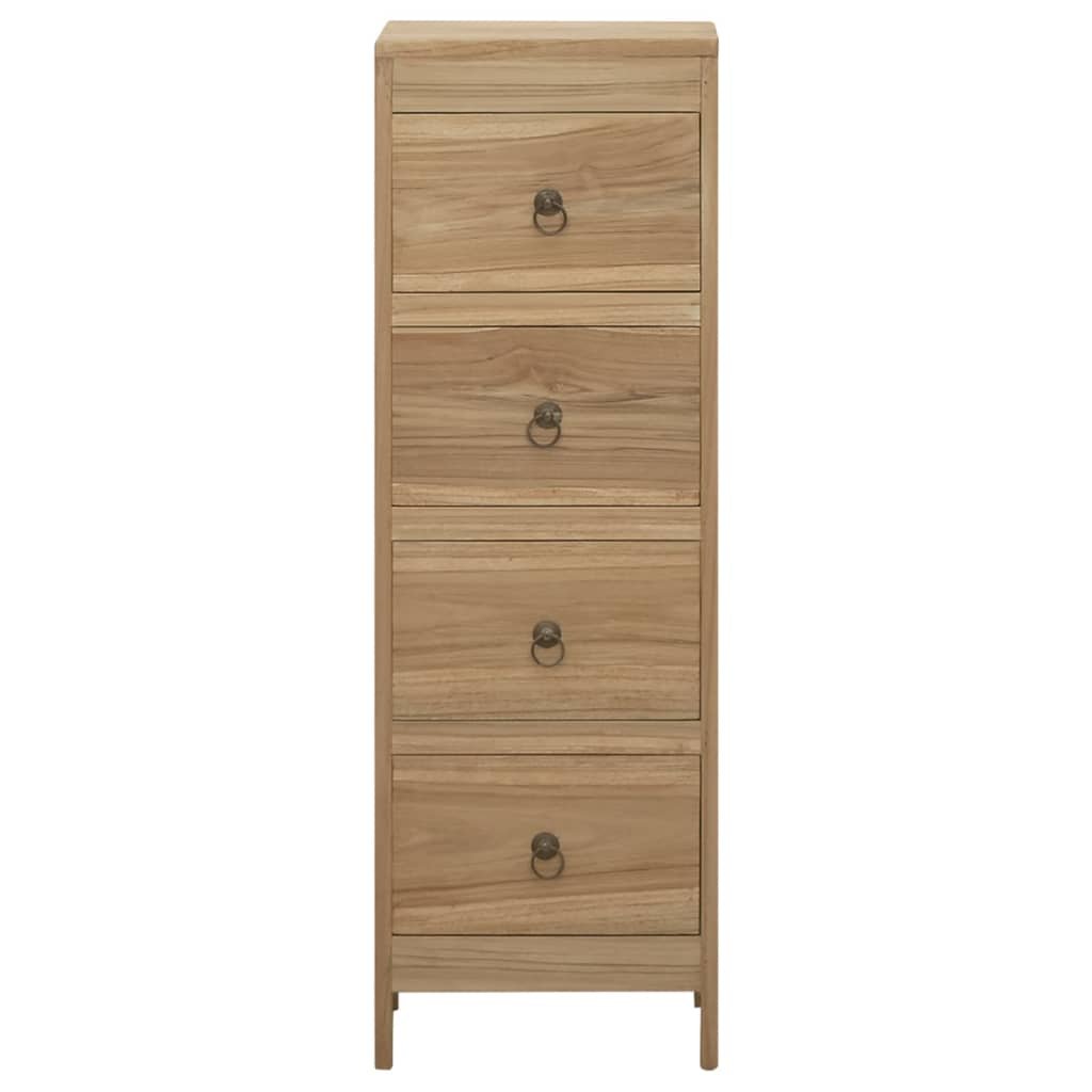 Deze ladekast is gemaakt van massief teakhout, straalt een vintage charme uit en is de blikvanger van je interieur.Hoogwaardig materiaal: massief teakhout is een prachtig, natuurlijk materiaal. Het is gewaterd, in de oven gedroogd en vervolgens behandeld met een rustieke afwerking. Teakhout staat bekend om zijn uitzonderlijke kracht en weerbestendigheid.Opbergfunctie: deze bijzetkast heeft 4 lades waardoor er voldoende ruimte is voor het opbergen van kleding, boeken en andere spullen.Praktisch blad: het stevige blad is ideaal voor het plaatsen van decoratieve spullen, fotolijstjes en potplanten. Waarschuwing:dit product moet met de bijgeleverde materialen aan de wand gemonteerd worden, om eventueel kantelen/omvallen te voorkomen.